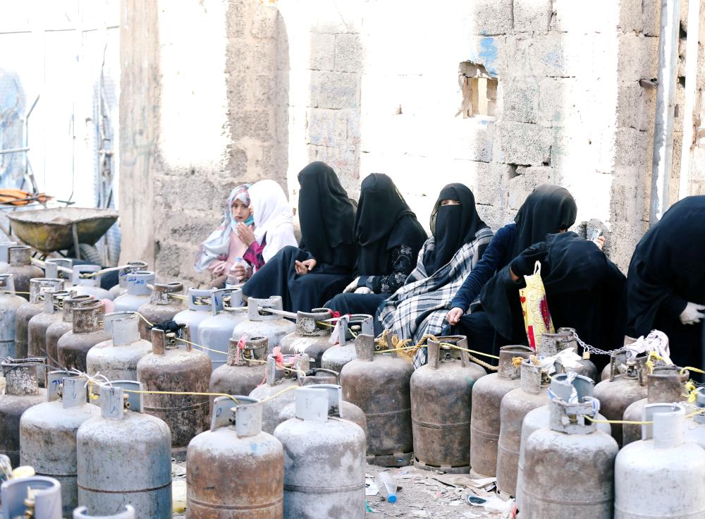 يمنيات بانتظار ملء اسطوانات الغاز جراء الأزمة التي فرضتها الميليشيا الحوثية في صنعاء أمس الأول. (رويترز)