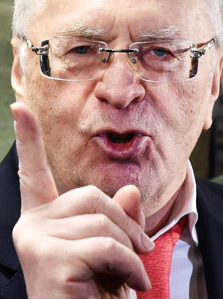 المرشح الرئاسي الروسي وزعيم الحزب الديموقراطي الليبرالي المحافظ فلاديمير جيرينوفسكي، يتحدث إلى الصحفيين أثناء زيارته مركز تدريب الأمن الخاص في موسكو أمس. (أ ف ب)