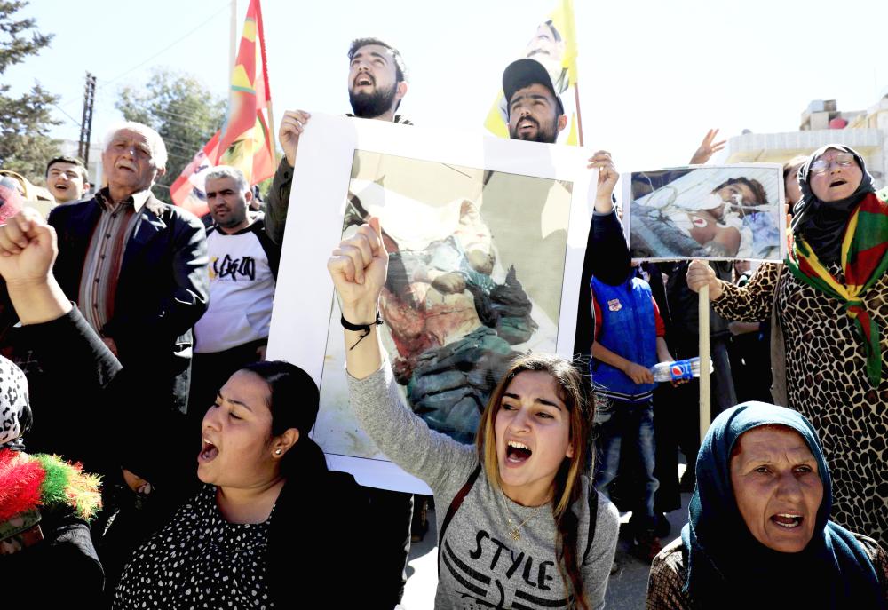 سوريون أكراد في مدينة القامشلي يتظاهرون ضد العملية التركية في عفرين أمس. (أ.ف.ب)