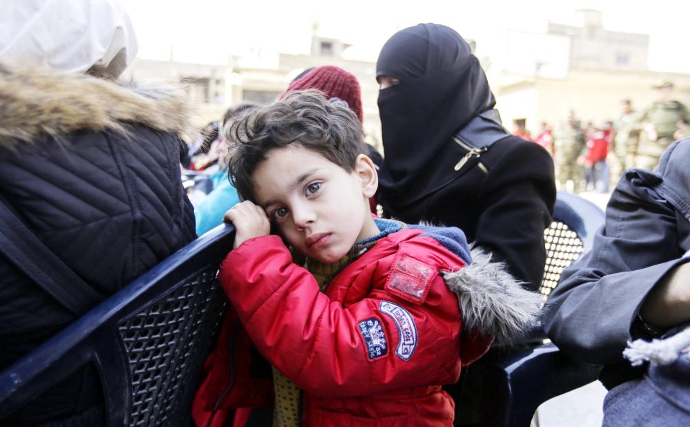 طفل سوري نازح مع أسرته عن الغوطة ضمن المدنيين الذين أجلوا عن المنطقة أمس. (أ ف ب)