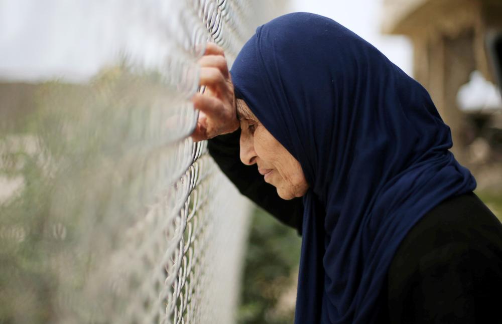 فلسطينية في حالة تعب تقف إلى جانب سياج خلال مظاهرة تدعو السلطات المصرية إلى فتح معبر رفح الحدودي جنوب قطاع غزة أمس. (رويترز)