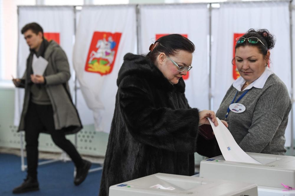 امرأة روسية تضع ورقتها في أحد صناديق الاقتراع