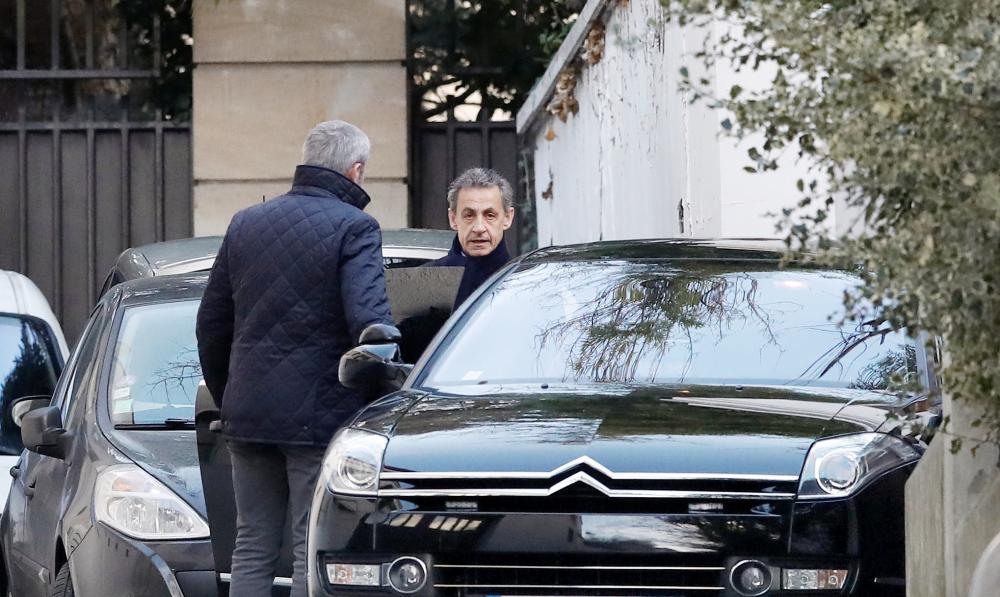 ساركوزي يركب سيارته من أمام منزله في باريس في طريقه إلى مقر التحقيقات أمس. (رويترز)