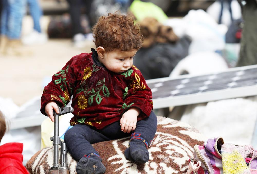 طفل سوري يجلس على حقيبة ممسكا فوهة بندقية بعد وصول حافلة نازحين من الغوطة إلى حماة أمس. (أ ف ب)