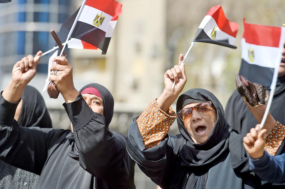 سيدتان ترفعان علم مصر بانتظار التصويت في الانتخابات الرئاسية أمس. (أ.ف.ب)