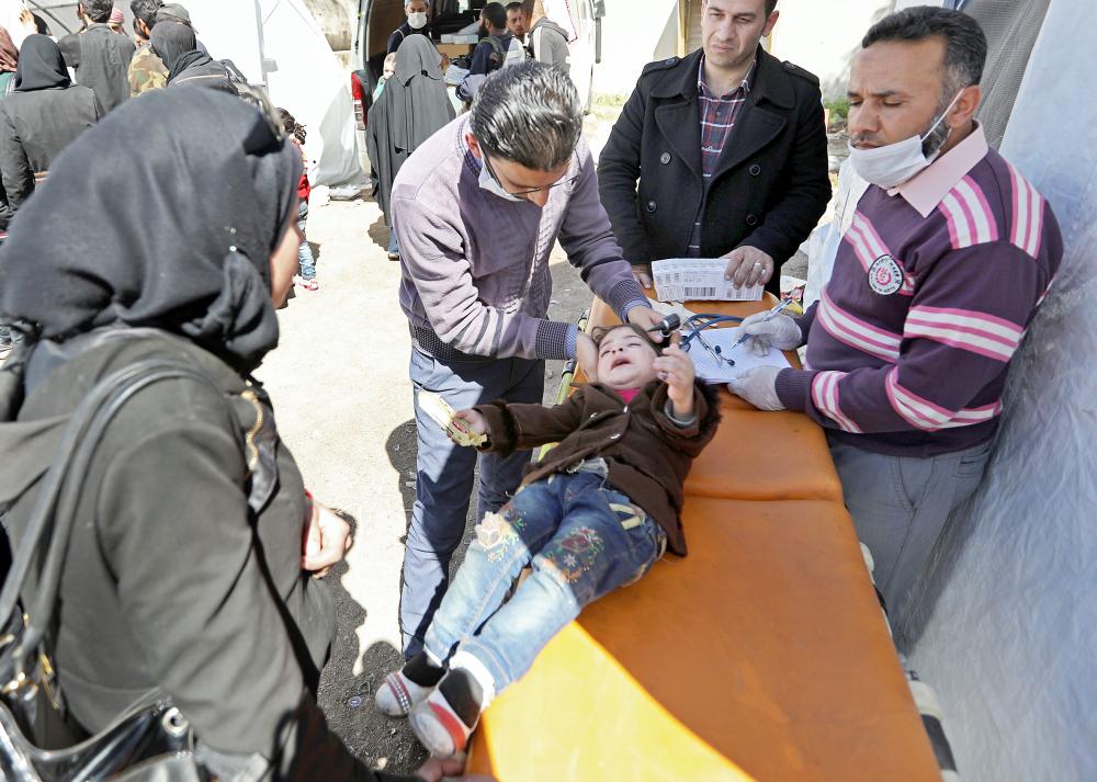 Syrian paramedics give medical attention to a girl after arriving on a convoy transporting civilians and rebel fighters to the village of Qalaat al-Madiq, about 45 kilometres northwest of the central city of Hama, on March 26, 2018 after their evacuation from Eastern Ghouta following a deal with the regime. / AFP / OMAR HAJ KADOUR