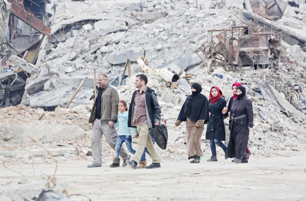 سوريون يسيرون في شارع مدمر في بلدة حرستا خلال نزوحهم من الغوطة أمس. (رويترز)
