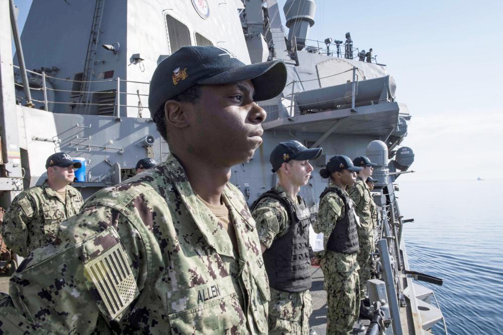 بحارة أمريكيون على متن البارجة «دونالد كوك» أثناء الاستعدادات لمغادرة ميناء العاصمة القبرصية لارنكا باتجاه سورية، أمس الأول. (أ.ف.ب)