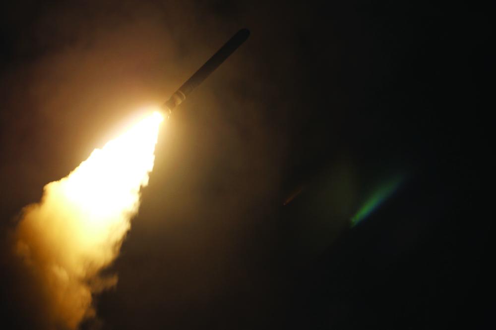 صاروخ توماهوك أطلقته الولايات المتحدة على موقع للنظام السوري أمس. (أ.ف.ب)