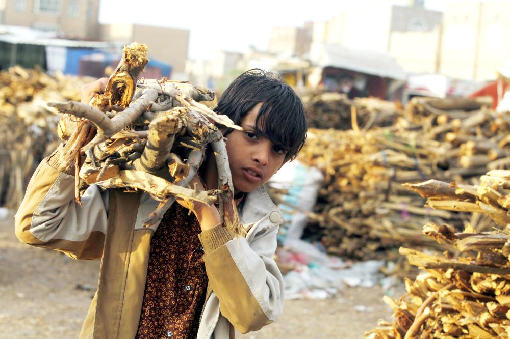طفل يمني يحمل حطبا للطهي في سوق بصنعاء أمس جراء أزمة الغاز الخانقة التي فرضها الحوثيون على اليمنيين. (أ ف ب)