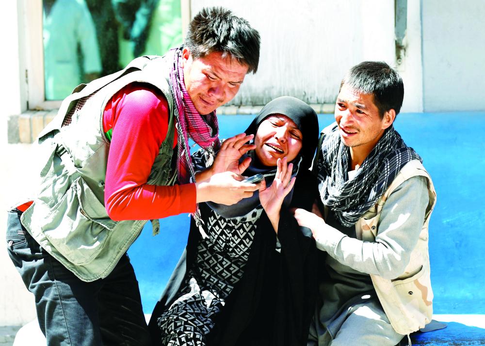 أقارب الضحايا في حالة حزن وبكاء في أحد مستشفيات العاصمة كابول بعد الهجوم الانتحاري أمس. (رويترز)