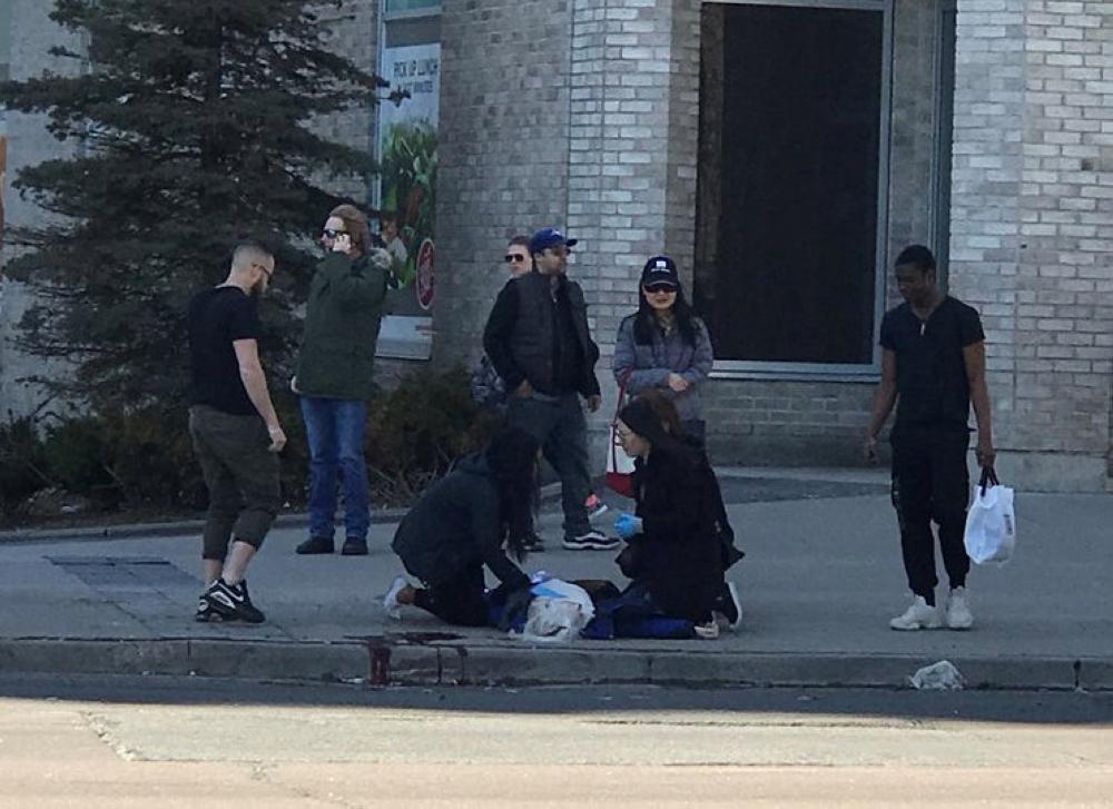 يتم مساعدة الضحية من قبل المشاة بعد أن اصطدمت شاحنة بأشخاص متعددين في تقاطع رئيسي في تورنتو اليوم. (رويترز)