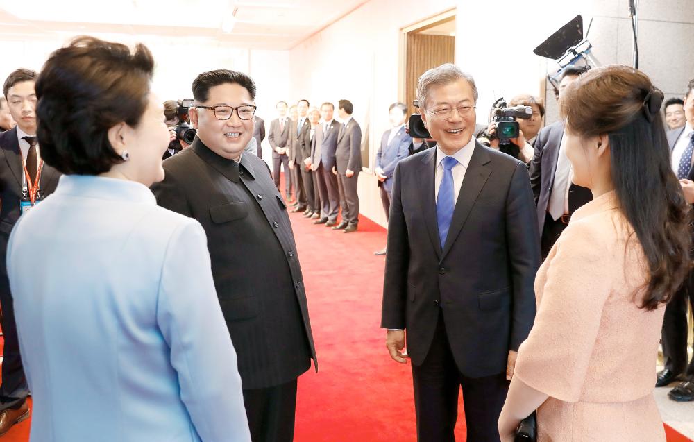 زعيما الكوريتين وزوجتاهما يتبادلون الأحاديث عقب القمة أمس الأول. (رويترز)