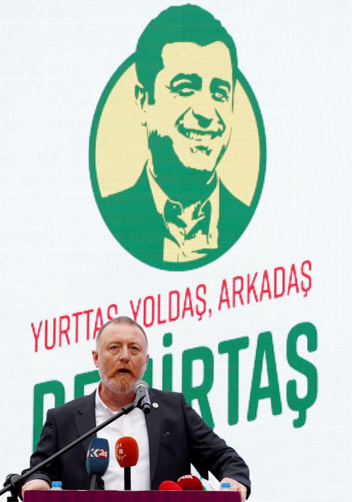 سيزاي تيميلي الرئيس المشارك للحزب الديمقراطي الشعبي المؤيد للأكراد يتحدث خلال جمع في أسطنبول. (رويترز)