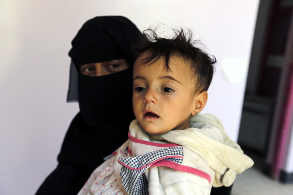 epa06713603 A Yemeni woman holds her malnourished child at a hospital amid worsening malnutrition, in Sana'a, Yemen, 05 May 2018. According to reports, an estimated 3.3 million children in Yemen are malnourished, with more than 400 thousand children under the age of five facing severely malnutrition. EPA/YAHYA ARHAB
