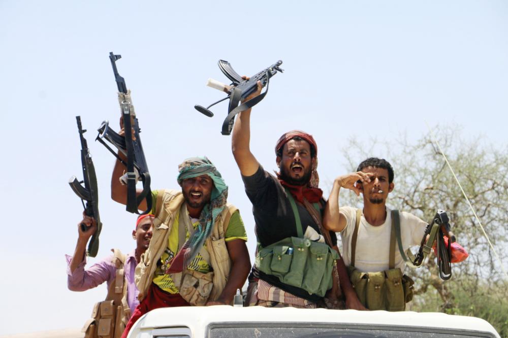 عناصر من المقاومة الشعبية يحتفلون بالانتصارات غرب تعز أمس. (إ.ب.أ)