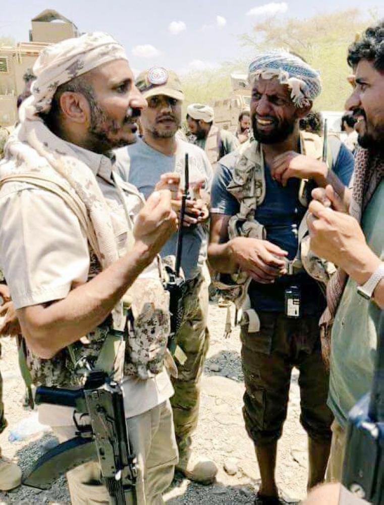 طارق صالح مع ضباط من الجيش الوطني في منطقة البرح أمس. (إعلام الجيش)