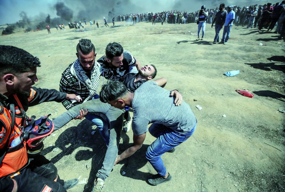 محتجون فلسطينيون يحملون متظاهراً أصيب خلال المصادمات بعد احتجاجات في شرق قطاع غزة. (إي ب أ)