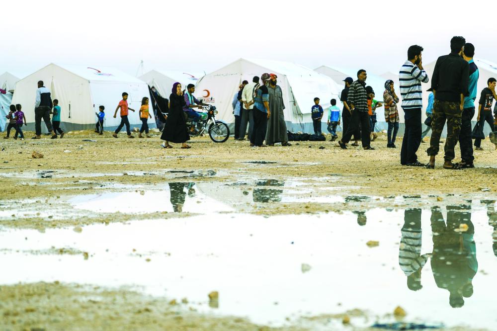 تجمعات لمواطنين سوريين في مخيم يدعمه الهلال الأحمر التركي للنازحين من الغوطة الشرقية، بالقرب من قرية بيل، شمال ريف حلب، أمس. (إي ب أ)