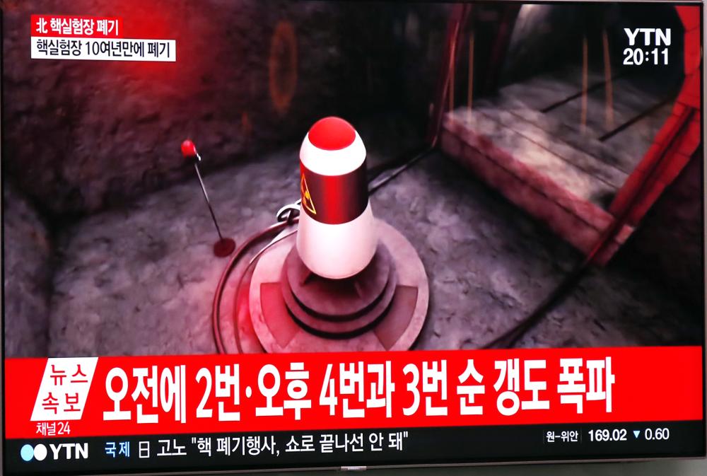 لقطة البث التلفزيوني الذي شاهده الكوريون أمس عن تفكيك موقع التجارب النووية وتدمير المنشأة. (إي ب أ)