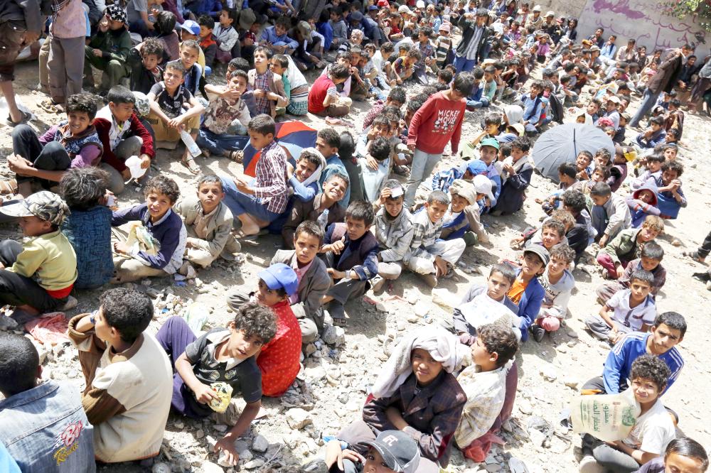 أطفال يمنيون ينتظرون الحصول على حصص غذائية تقدمها مؤسسة خيرية في صنعاء أمس الأول. (أ. ف. ب)