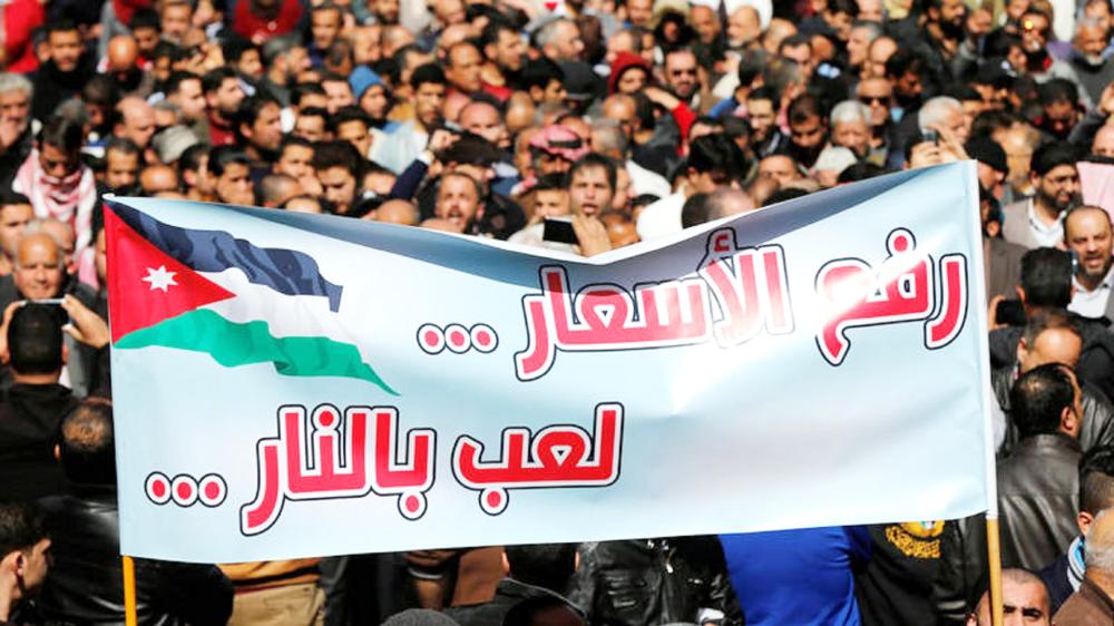 أردنيون يتظاهرون احتجاجا على ارتفاع الأسعار وضريبة الدخل في عمان أمس الأول. (رويترز)