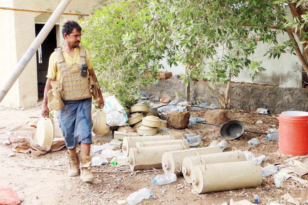 جندي من الجيش اليمني يقف بجوار مجموعة من الألغام التي انتزعها من مطار الحديدة أمس. (إ.ب.إ)