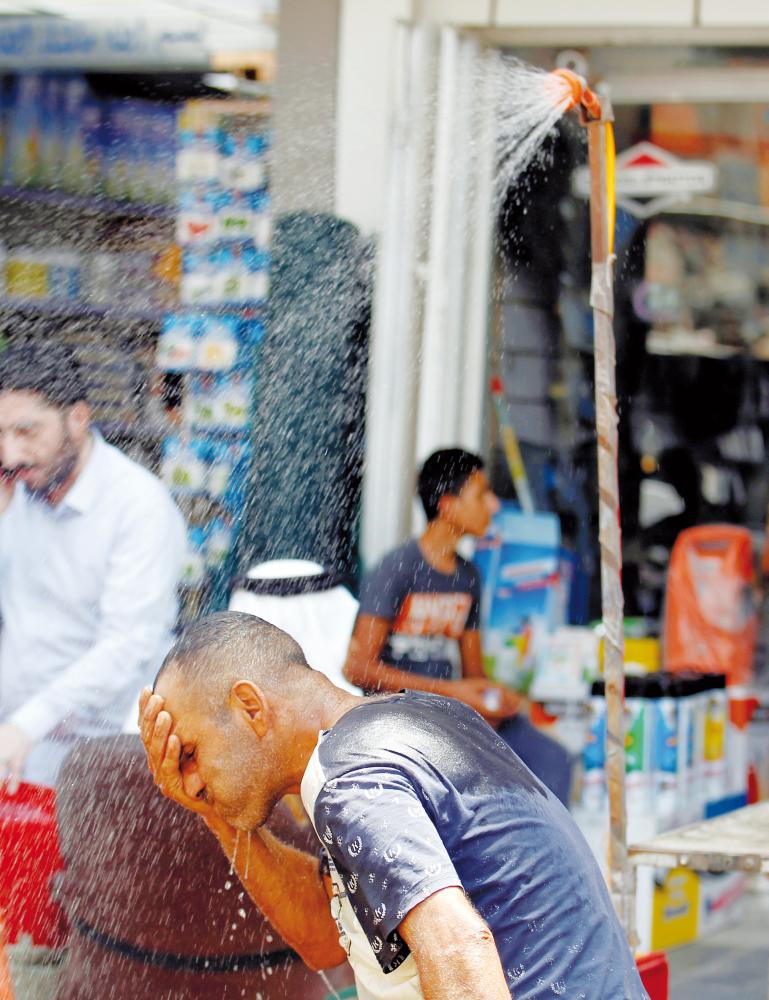 رجل يقف تحت دش الماء في الهواء الطلق أمس، ليتبرد في يوم صيفي حارق في بغداد. (رويترز)