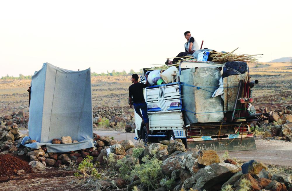 نازحون سوريون من درعا في مخيم مؤقت قرب الحدود من الجولان، أمس الأول. (أ ف ب)