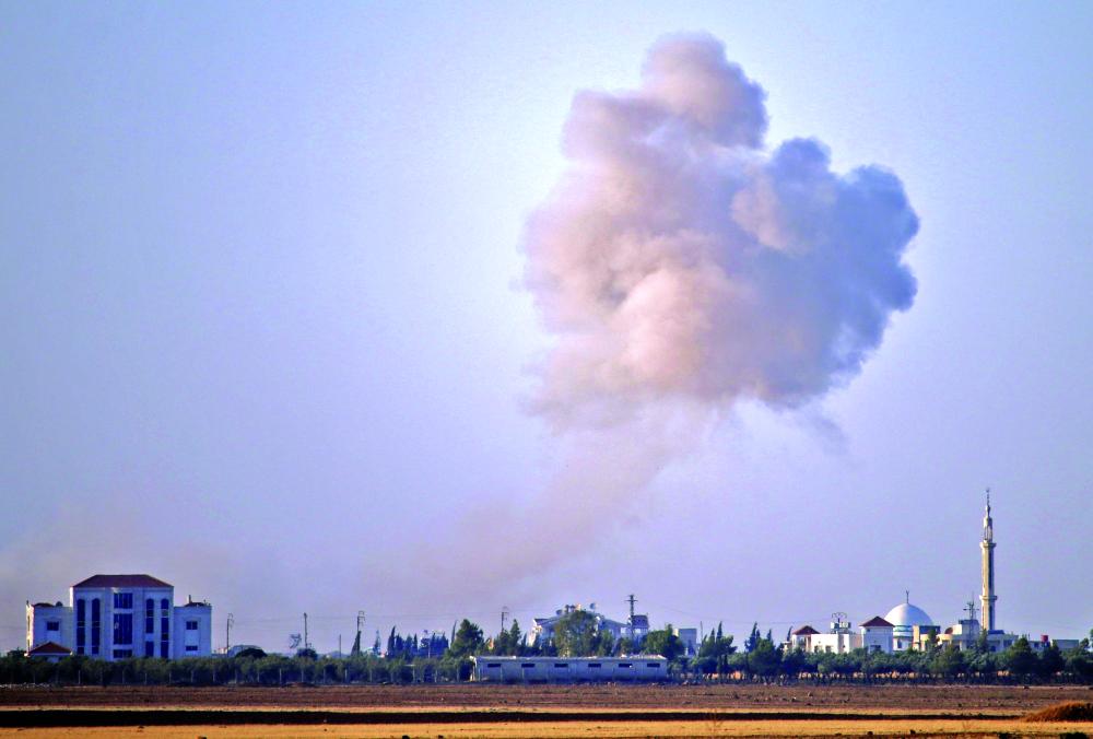 ارتفاع ألسنة اللهب وأعمدة الدخان جراء القصف الجوي والغارات المكثفة على درعا من قبل قوات النظام السوري، أمس الأول. (أ.ف.ب)