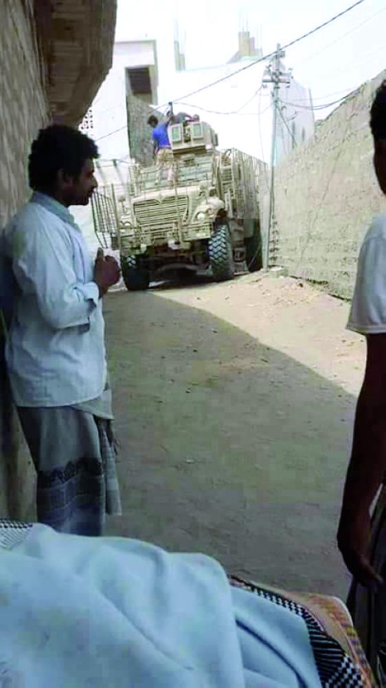 آلية للتحالف العربي تمشط شارعاً في مدينة التحيتا أمس. (إعلام الجيش)