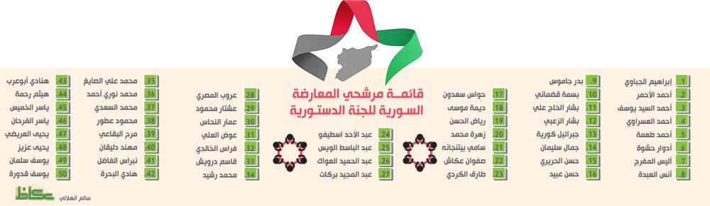 وحصلت «عكاظ» على قائمة أسماء أعضاء اللجنة الدستورية من قبل المعارضة السورية، فيما يحتفظ المبعوث الأممي ستيفان دي ميستورا بقائمته التي يتولى الإشراف عليها، إلا أن مصدرا مطلعا في المعارضة قال إن دي ميستورا يسعى لجمع شخصيات من المعارضة والنظام، على أن يكون هناك دور واسع للمرأة السورية.