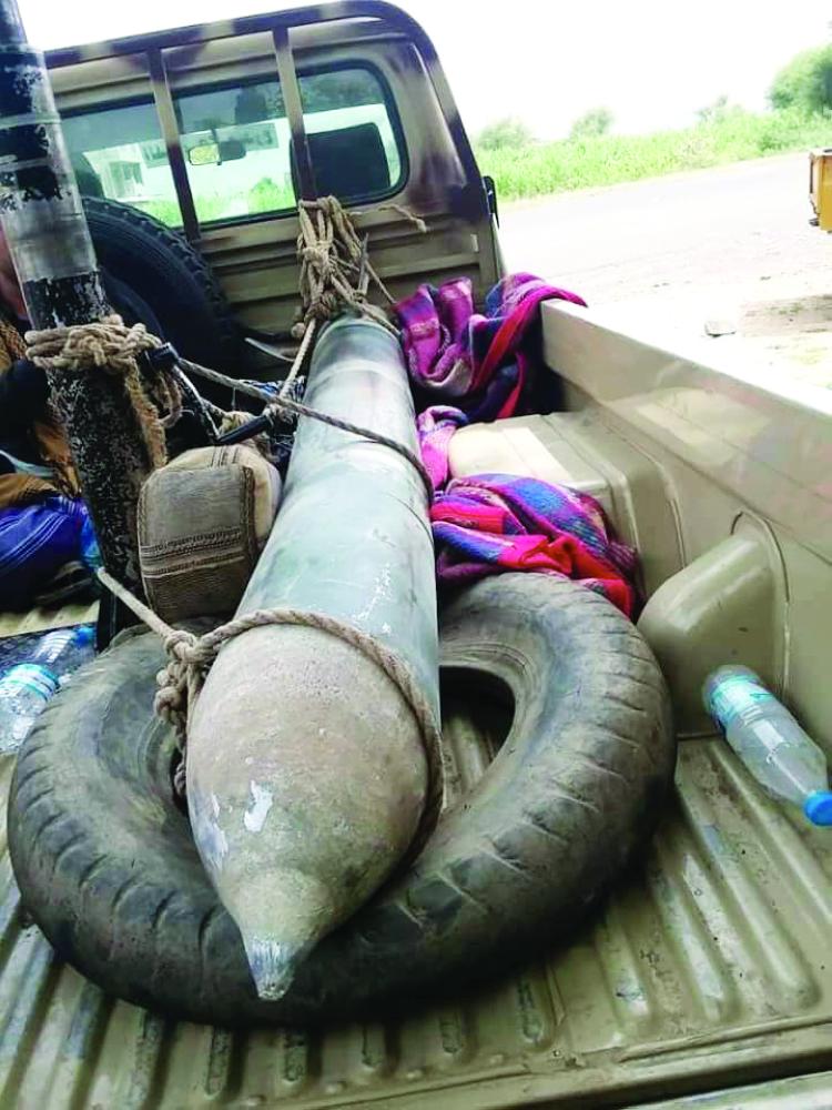 صاروخ «زلزال» الإيراني أطلقه الحوثيون على قرية في تعز أمس دون أن ينفجر. (عكاظ)
