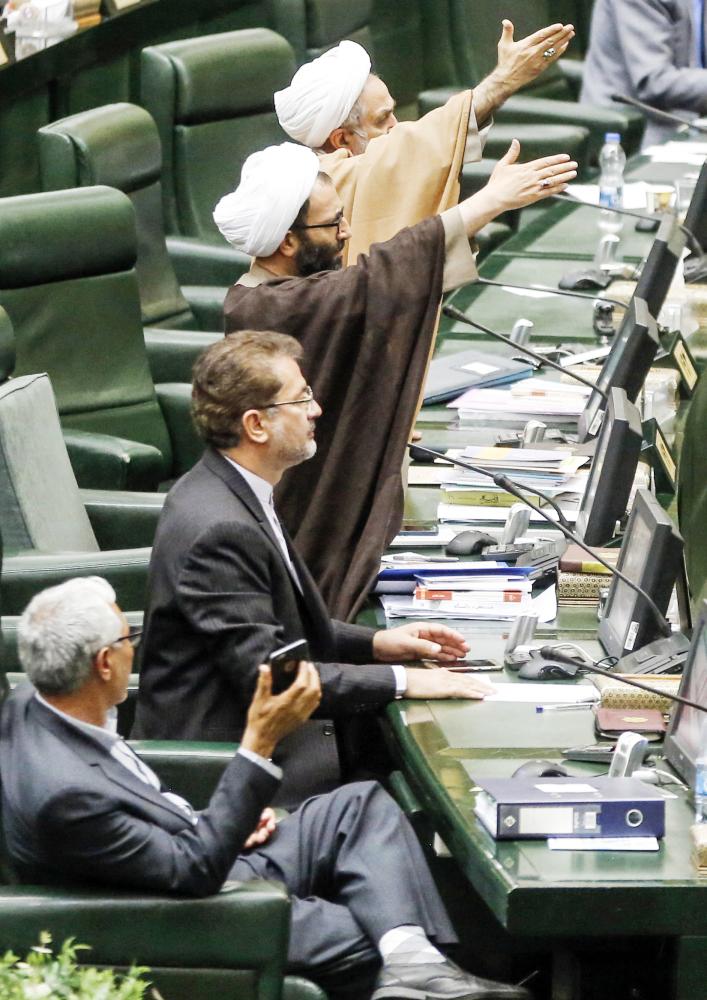 نواب إيرانيون أثناء التصويت على عزل وزير المالية خلال جلسة البرلمان أمس. (أ.ف.ب)