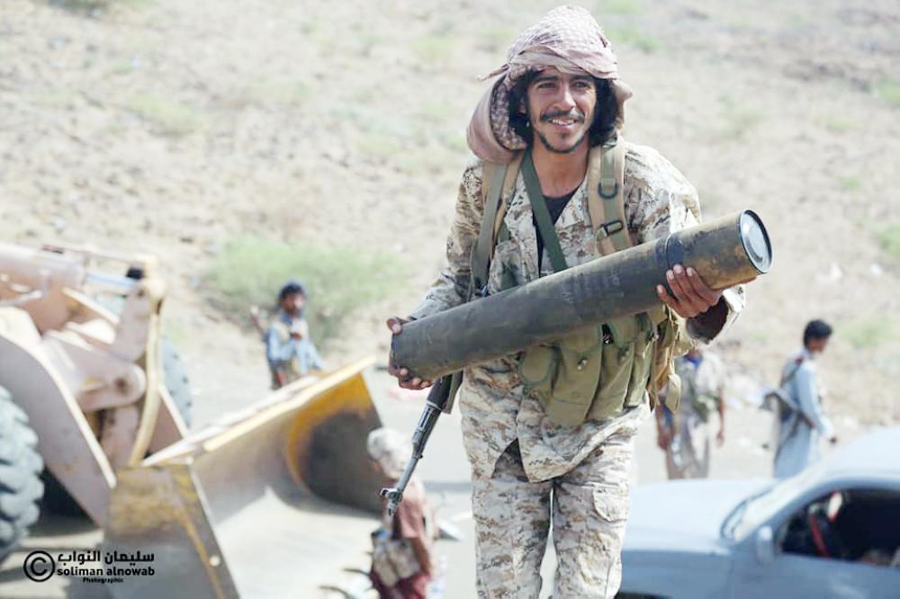 جندي يمني يحمل قذيفة دبابة خلال مواجهات مع الانقلابيين في البيضاء. (تصوير: سليمان النواب)