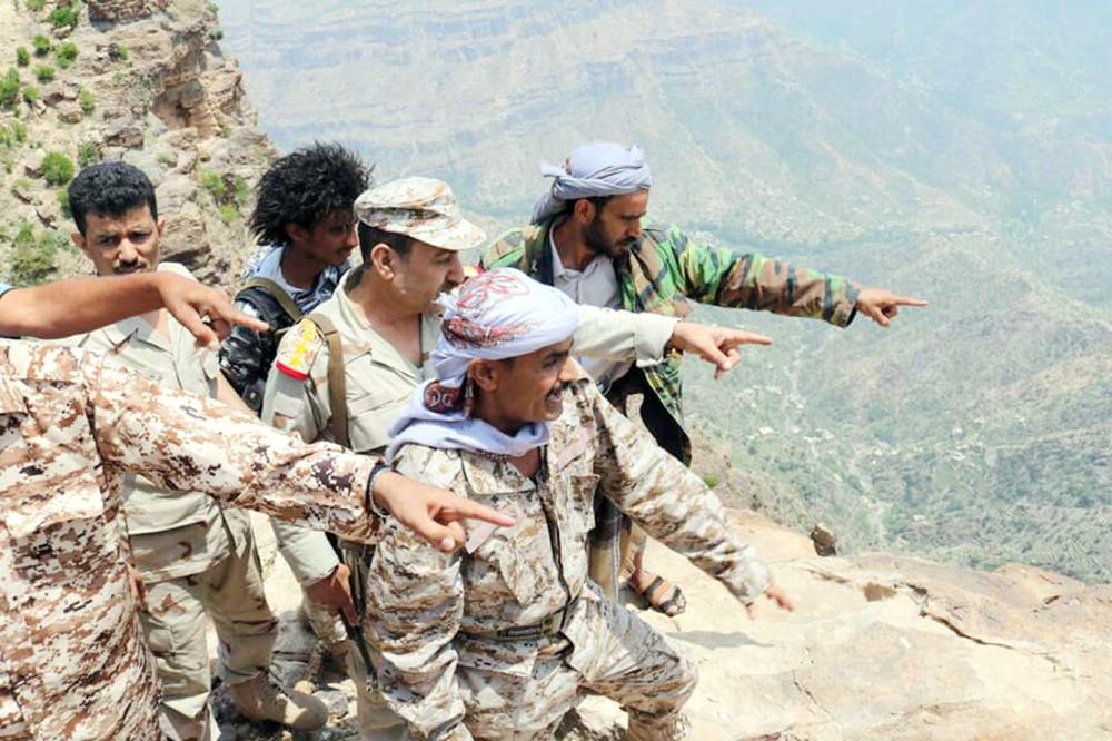 قيادات من الجيش اليمني أثناء عملية ملاحقة الميليشيا الحوثية في منطقة الشريجة الواقعة بين محافظتي تعز ولحج. (إعلام الجيش)