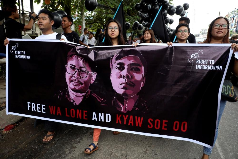 نظم عشرات الصحفيين والنشطاء مسيرة في يانجون عاصمة ميانمار، اليوم (السبت) للمطالبة باطلاق سراح الصحفيين وا لون (32 عاماً) وكياو سوي أو (28 عاماً) قبل الحكم بشأن اتهامهما بخرق قانون الأسرار الرسمية للدولة.