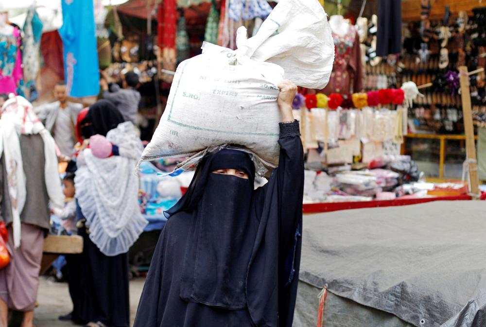امرأة تحمل كيساً من الحبوب في الحي القديم في صنعاء أمس الأول. (رويترز)