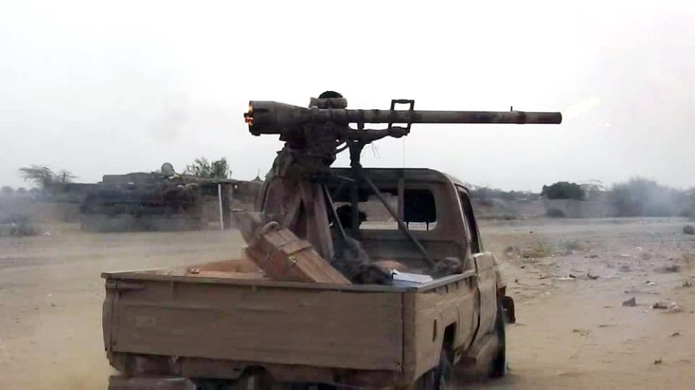 جندي يمني يطلق قذيفة أثناء المعارك مع الميليشيات في عبس بمحافظة حجة، أمس. (إعلام الجيش)