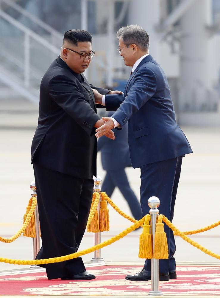 واستقبل كيم مون بالأحضان والابتسامات بعد وصول رئيس كوريا الجنوبية إلى عاصمة كوريا الشمالية لإحياء زخم المحادثات المتعثرة بين واشنطن وبيونغ يانغ بشأن نزع السلاح النووي وآفاق إنهاء الحرب الكورية رسميا.