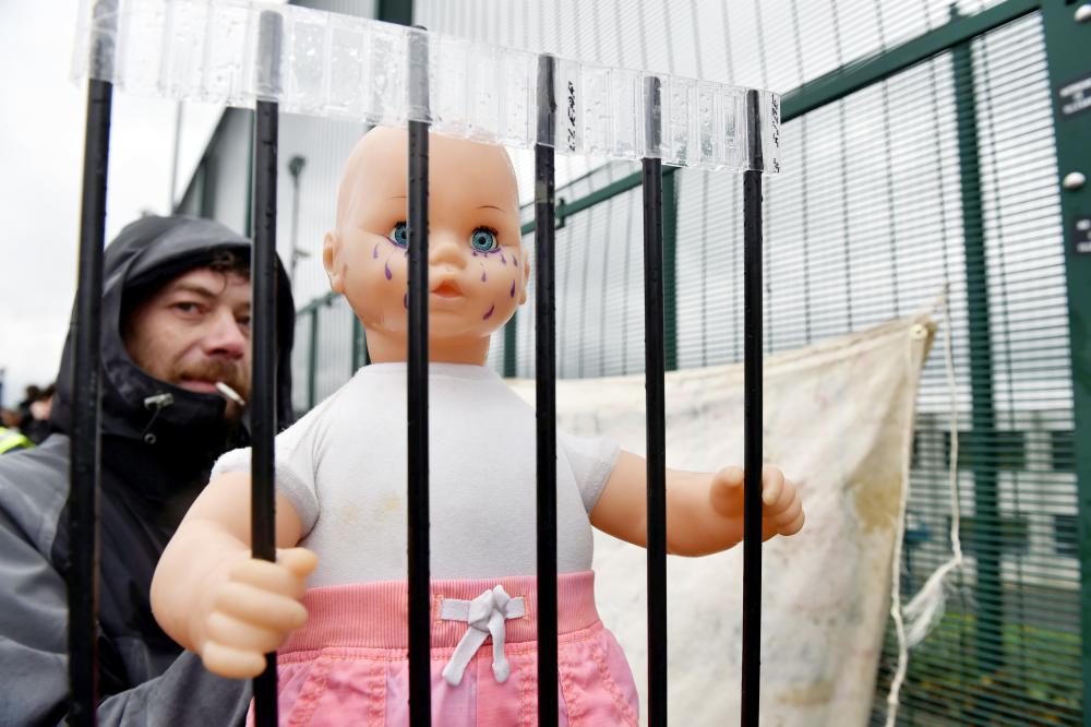 محتج يحمل دمية وراء قضبان سجن رمزية أثناء مشاركته في مظاهرة خارج مخيم مغلق لطالبي اللجوء في بلجيكا أمس. (رويترز)