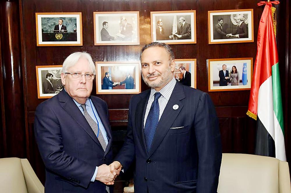 قرقاش خلال لقائه المبعوث الأممي في اليمن مارتن غريفيث.