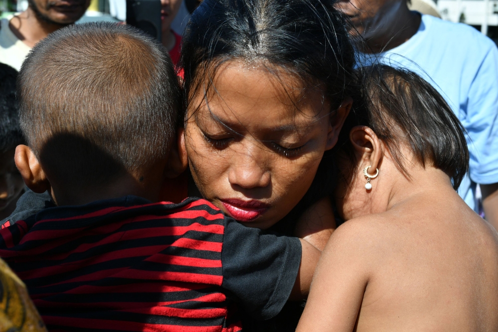 TOPSHOT - Susi Rahmatia, 26, holds her second child (R) and Jumadil (L), 5, after he went missing for seven days following the earthquake and tsunami, at a shelter in Palu on October 5, 2018. Susi Rahmatia thought her five-year-old son Jumadil was dead, but on Friday -- a week after they were separated by Indonesia's earthquake and tsunami – they enjoyed a miraculous and emotional reunion. / AFP / ADEK BERRY