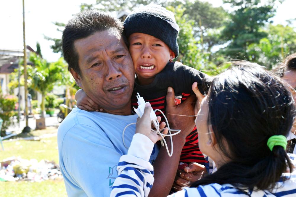 طفل يبكي أثناء لقاء والديه بعد اختفائه سبعة أيام عقب الزلزال والتسونامي، إذ وجدوه في ملجأ في بالو أمس الأول. (أ. ف. ب)