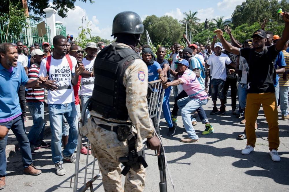 وأقام محتجون حواجز مشتعلة مستخدمين إطارات السيارات وأكوام القمامة فيما سمع دوي طلقات الرصاص في أرجاء العاصمة بورت أو برنس. وأطلقت الشرطة الغاز المسيل للدموع على بعض المتظاهرين ورد بعضهم برشق الشرطة بالحجارة.