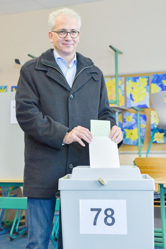 وزير الاقتصاد والنقل في هيسن والمرشح الأول لحزب الخضر في الانتخابات العامة طارق الوزير يدلي بصوته في مركز اقتراع أمس. (أ ف ب)