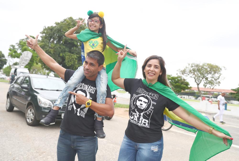 أسرة برازيلية داعمة للمرشح الرئاسي بولسونارو تعبر عن فرحتها في مركز اقتراع في ريو دي جانيرو أمس. (رويترز)