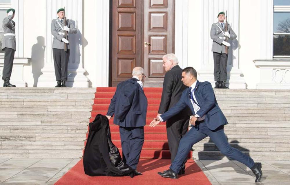 أحد الحراس الشخصيين يسارع إلى حمل معطف الرئيس التونسي الباجي قائد السبسي عند استقبال الرئيس الألماني له أمس. (أ. ف. ب)