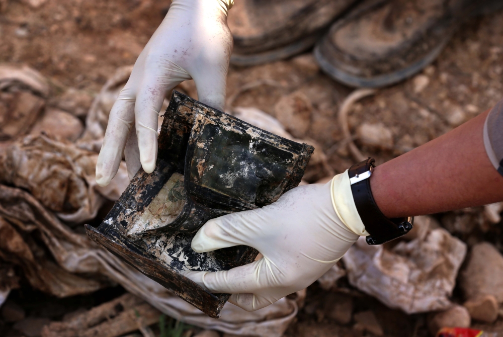 (FILES) In this file photo taken on February 03, 2015 a member of the Yazidi minority searches in a wallet for clues, that might lead him to missing relatives in the remains of people killed by the Islamic State (IS) jihadist group, a day after Kurdish forces discovered a mass grave near the Iraqi village of Sinuni, in the northwestern Sinjar area. The Islamic State group left behind more than 200 mass graves in Iraq containing up to 12,000 victims that could hold vital evidence of war crimes, the UN said November 6, 2018.