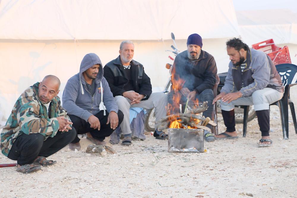 نازحون من اليرموك يوقدون نارا للتدفئة في مخيم للاجئين بريف عفرين أمس الأول. (أ ف ب)